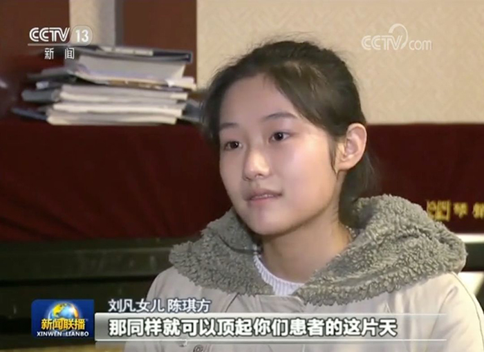 劉凡女兒 陳琪方:在我的世界里面,我的媽媽和我的外公是很行的。我把他們借給患者,他們能頂起我這個(gè)家,那同樣就可以頂起你們患者的這片天。我發(fā)了這篇文章以后,很多人說(shuō)加油、加油,那一瞬間覺(jué)得,這個(gè)年挺暖和的。
