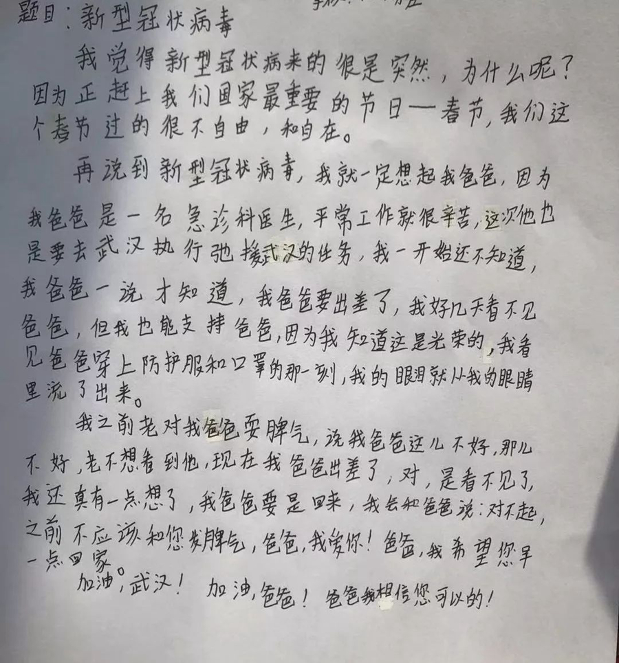 信里他先反思了一下自己,說以前盼望著爸爸上班,不希望爸爸在家管他。現(xiàn)在爸爸去前線,我想到危險性,現(xiàn)在又特別希望爸爸安安全全地回家,然后還說了一句,爸爸我愛你!以前從來沒有過。我跟他說,我希望你在生活和學習中面對困難,無所畏懼,一直向前,我還說爸爸不一定是你的驕傲,但一定要做你的榜樣。
