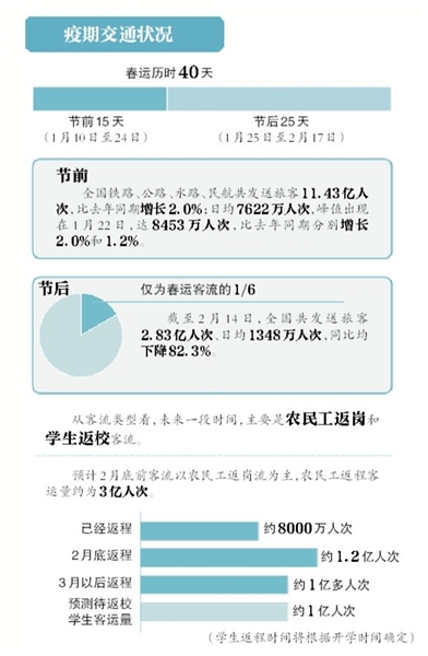 從客流類型看,未來一段時間,主要是農民工返崗客流和學生返??土?,公務商務客流較少、旅游客流很少。預計2月底前客流以農民工返崗流為主,2月底前將迎來學生返??土?。