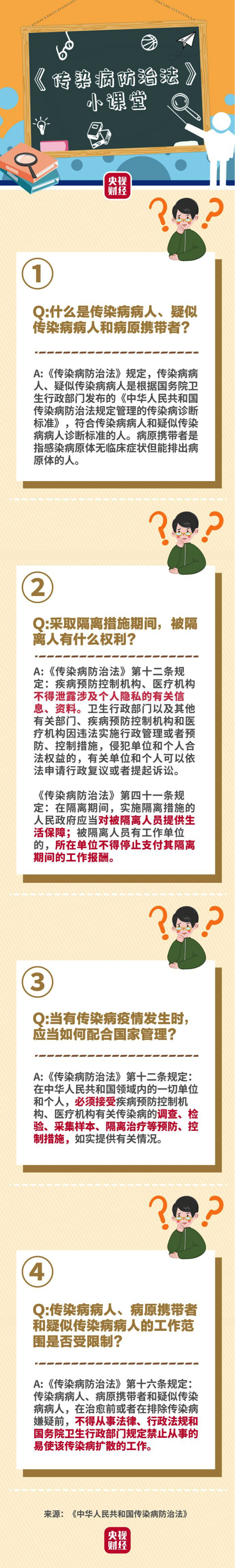 隔離期間不工作,你還能拿到工資嗎?配合疾病預防控制機構、醫療機構調查,你的個人信息會被泄露嗎?在治愈前或者在排除傳染病嫌疑前,你的工作范圍受限嗎?新冠肺炎疫情當下,我們該如何用法律保護自己?央視財經今天推出《傳染病防治法》小課堂第二期,戳一圖↓↓