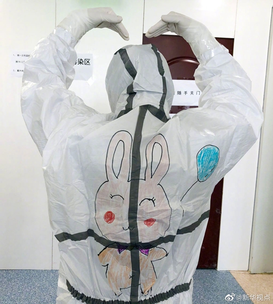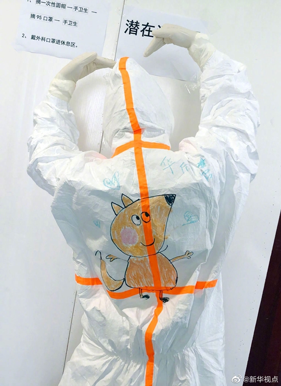 武漢兒童醫(yī)院新冠肺炎患兒隔離病房里,不少住院小朋友見到被防護服層層包裹的醫(yī)護人員時,曾經(jīng)的第一反應是害怕和抗拒。護士王佳想到了一個妙招:在防護服上面畫卡通畫,再讓小朋友涂色。在她的帶動下,病區(qū)里很多醫(yī)務人員都也這么做。一幅幅承載著愛心的畫,沖淡了疫情給孩子們的心理壓力。(記者才揚;武漢兒童醫(yī)院供圖)
