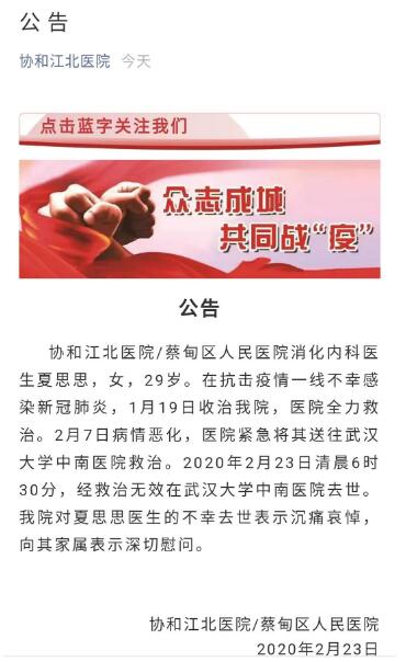 23日下午2時許,協(xié)和江北醫(yī)院發(fā)布公告,哀悼夏思思醫(yī)生。公告稱,協(xié)和江北醫(yī)院/蔡甸區(qū)人民醫(yī)院消化內(nèi)科醫(yī)生夏思思,女,29歲。因在抗擊疫情一線不幸感染新冠肺炎,于2月23日清晨6時30分在武漢大學(xué)中南醫(yī)院去世。