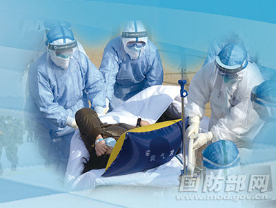 綜合科第一次接收病人正值晚上。看到一位80多歲的老人行動不便,56歲的軍醫(yī)毛青跨上救護車,一把抱起老人輕輕放在擔架上。