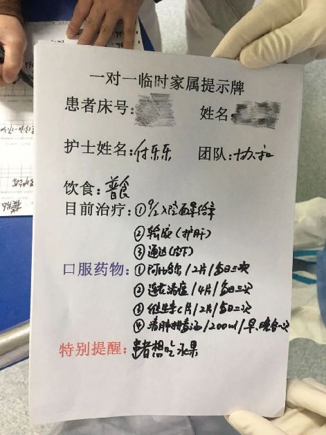 我們從人文護理的角度出發(fā),聯(lián)合武漢協(xié)和醫(yī)院成立了一支以關愛患者心理和生活的“臨時家屬”護理隊伍。三十多名名護士踴躍報名,加入到了這個有愛的隊伍中。為確保人文護理項目達到預期效果,病區(qū)制定了《“臨時家屬”管理規(guī)范》《人文關懷方案》。