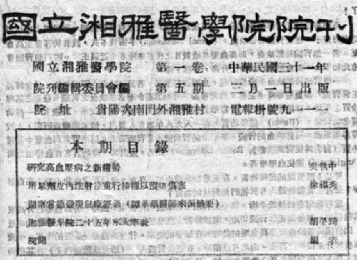 1942年3月1日《國立湘雅醫(yī)學院院刊》第一卷第五期封面;第三條為“湖南常德發(fā)現(xiàn)鼠疫經過(譚學華醫(yī)師來函摘要)”