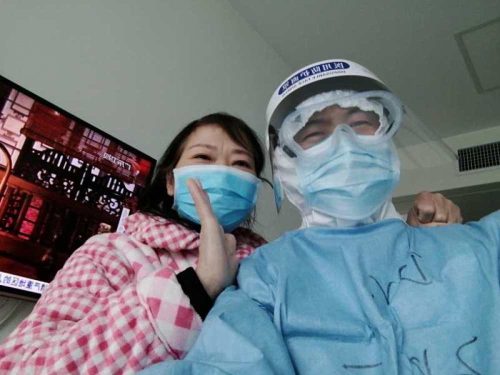 圖為北醫(yī)三院援湖北醫(yī)療隊劉慧強和患者在一起。