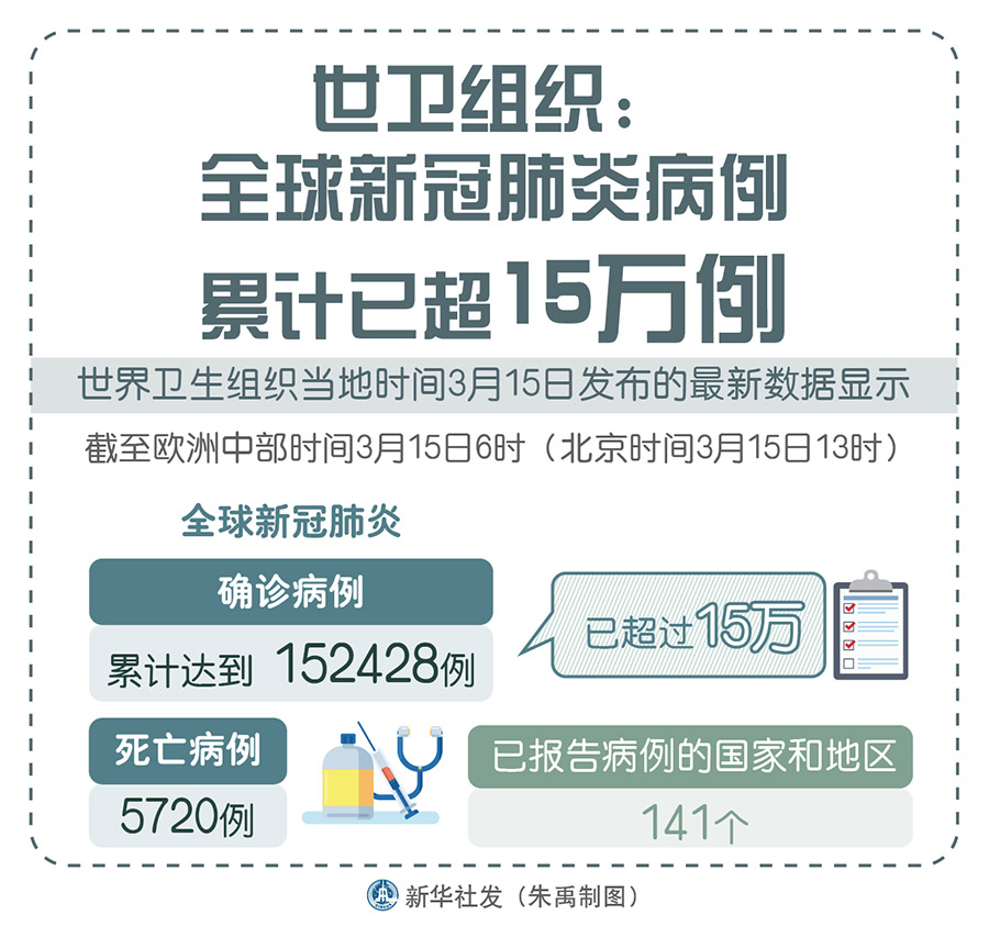 新華社日內(nèi)瓦3月15日電(記者劉曲)世界衛(wèi)生組織15日發(fā)布的最新數(shù)據(jù)顯示,全球新冠肺炎病例累計已超過15萬,達到152428例。