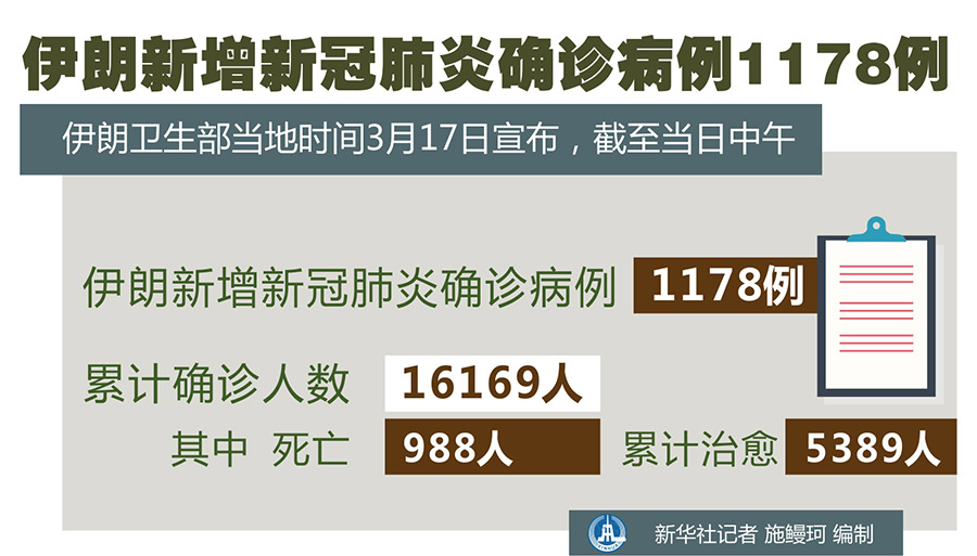 新華社德黑蘭3月17日電(記者陳霖)伊朗衛(wèi)生部17日宣布,截至當(dāng)日中午,伊朗新增新冠肺炎確診病例1178例,累計(jì)確診人數(shù)達(dá)到16169人,其中988人死亡,累計(jì)治愈5389人。