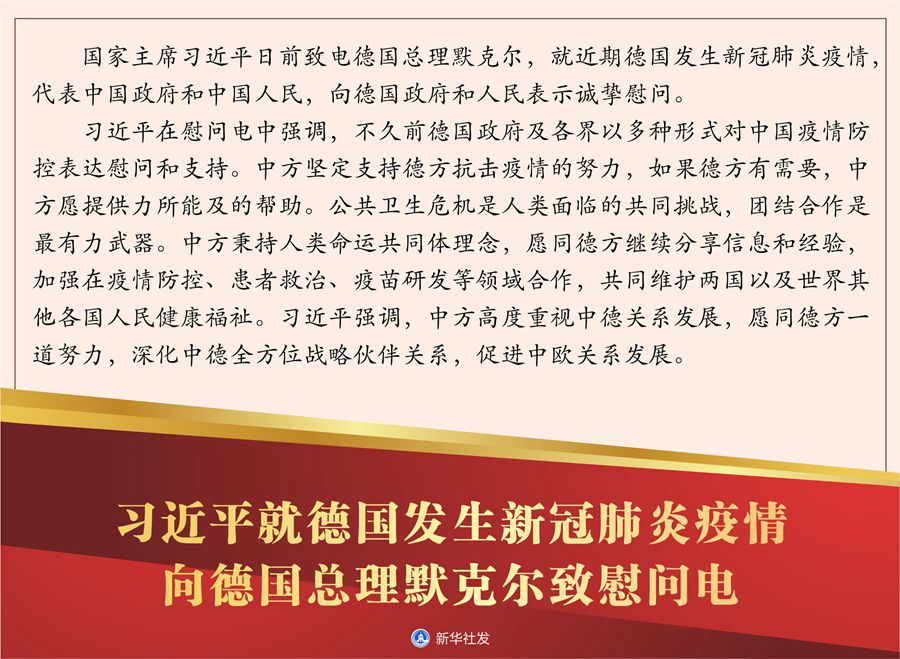 習(xí)近平在慰問電中強(qiáng)調(diào),不久前德國政府及各界以多種形式對中國疫情防控表達(dá)慰問和支持。中方堅(jiān)定支持德方抗擊疫情的努力,如果德方有需要,中方愿提供力所能及的幫助。公共衛(wèi)生危機(jī)是人類面臨的共同挑戰(zhàn),團(tuán)結(jié)合作是最有力武器。中方秉持人類命運(yùn)共同體理念,愿同德方繼續(xù)分享信息和經(jīng)驗(yàn),加強(qiáng)在疫情防控、患者救治、疫苗研發(fā)等領(lǐng)域合作,共同維護(hù)兩國以及世界其他各國人民健康福祉。習(xí)近平強(qiáng)調(diào),中方高度重視中德關(guān)系發(fā)展,愿同德方一道努力,深化中德全方位戰(zhàn)略伙伴關(guān)系,促進(jìn)中歐關(guān)系發(fā)展。