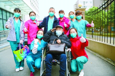昨天上午,武漢協(xié)和醫(yī)院西院北京醫(yī)療隊負責的病區(qū)內,一名91歲的老兵孫爺爺康復出院,與平日里照料自己的醫(yī)護人員合影時,老兵敬了一個軍禮。記者 和冠欣攝