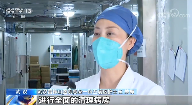 武漢雷神山醫(yī)院感染一科五病區(qū)護(hù)士長 關(guān)梅:我們病區(qū)結(jié)束工作以后,護(hù)士還將進(jìn)入艙里全面清理病房,整理儀器、設(shè)備、藥品,歸類并做消殺。