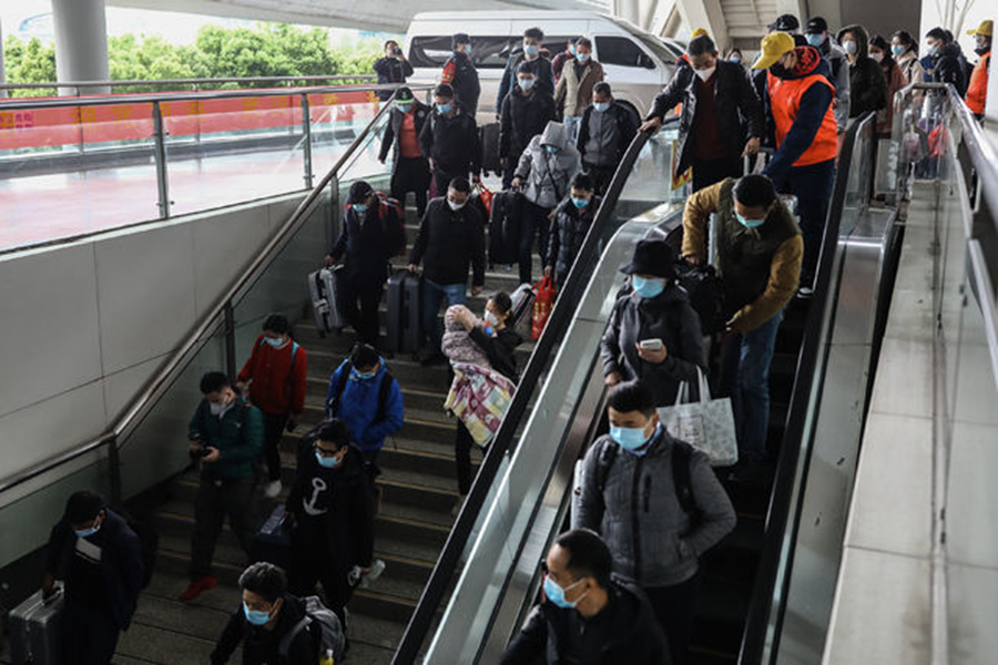 3月28日,武漢火車站,從廣州南到武漢的G1112次列車乘客乘坐電梯出站。趙迪/攝