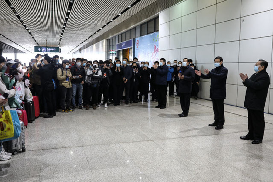 3月28日,武漢火車站,湖北省委書(shū)記應(yīng)勇(右二),省委副書(shū)記、省長(zhǎng)王曉東(右一)等人迎接從廣州南到武漢的G1112次列車乘客。記者 趙迪/攝