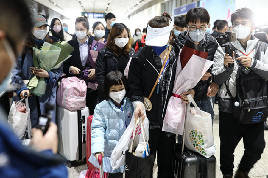 3月28日,武漢火車站,剛剛抵達(dá)的一家人。記者 趙迪/攝