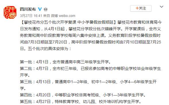 此外,四川攀枝花市教育和體育局近日也發布通知,從4月1日起,攀枝花分學段分批次錯峰開學。開學復課后,全市義務教育和高中階段教育學校每周六集中安排上課。義務教育階段學校暑假放假時間由7月3日順延至7月20日,高中階段學校暑假放假時間由7月10日順延至7月25日。
