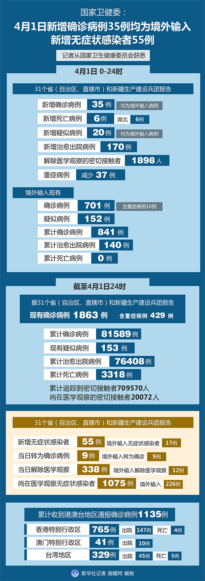 新華社北京4月2日電(記者王琦、田曉航)記者2日從國家衛生健康委員會了解到,4月1日0-24時,31個省(自治區、直轄市)和新疆生產建設兵團報告新增確診病例35例,均為境外輸入病例;新增死亡病例6例(湖北6例);新增疑似病例20例,均為境外輸入病例。