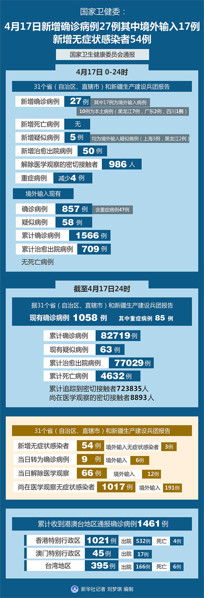 截至4月17日24時,據31個省(自治區、直轄市)和新疆生產建設兵團報告,現有確診病例1058例(其中重癥病例85例),累計治愈出院病例77029例,累計死亡病例4632例,累計報告確診病例82719例,現有疑似病例63例。累計追蹤到密切接觸者723835人,尚在醫學觀察的密切接觸者8893人。