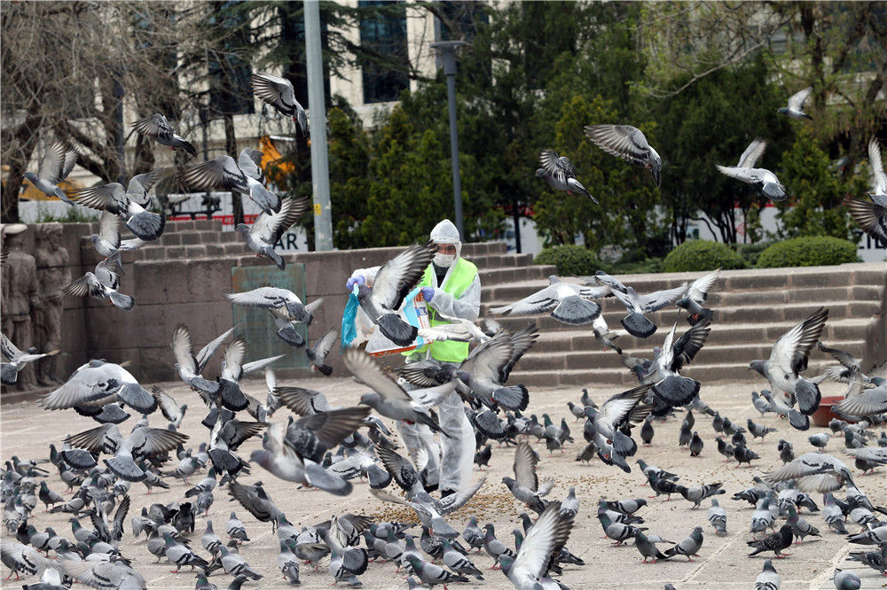 4月11日,土耳其首都、第二大城市安卡拉首度實施周末“居家令”時,政府工作人員給鴿子喂食 。新華社發(穆斯塔法·卡亞攝)