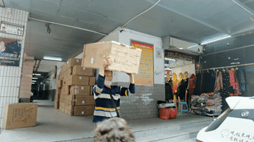 一小時(shí)后,一輛貨車駛進(jìn)狹窄的街區(qū),停在十幾米遠(yuǎn)外。冉光輝瞬間抖擻起精神,移下一個(gè)近半人高的箱子放到左邊肩頭,兩臂環(huán)抱貨物,小跑著往車上運(yùn)送。專職做“棒棒”多年,這一套程序他再熟悉不過。