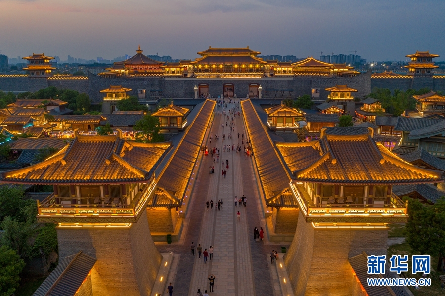 5月1日,游客在湖北省襄陽市唐城景區觀賞夜景(無人機照片)。 新華社發(楊東 攝)