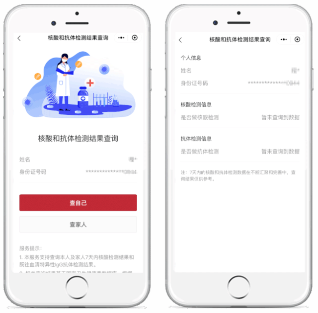 查家人:本服務還支持通過證件號實名查詢家人相關檢測結果信息,點擊“查家人”一鍵查詢,全家安心。