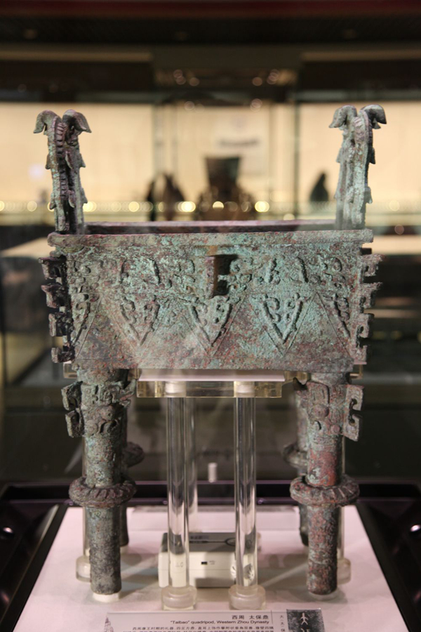“從形制大小來看,有別于三足圓鼎,這件四足方鼎應該是西周早期貴族所用的器物。方鼎高50.7厘米、口徑23.36厘米、重26公斤。方鼎的腹部內壁上清晰地鑄有‘大保鑄’三字銘文。據考證,這‘大保’二字其實應該為‘太保’,因此這件方鼎被稱作太保鼎。”陳卓說。