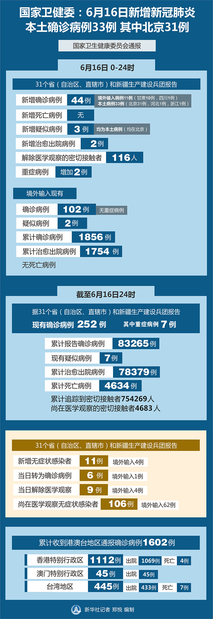 截至6月16日24時,據31個省(自治區、直轄市)和新疆生產建設兵團報告,現有確診病例252例(其中重癥病例7例),累計治愈出院病例78379例,累計死亡病例4634例,累計報告確診病例83265例,現有疑似病例7例。累計追蹤到密切接觸者754269人,尚在醫學觀察的密切接觸者4683人。