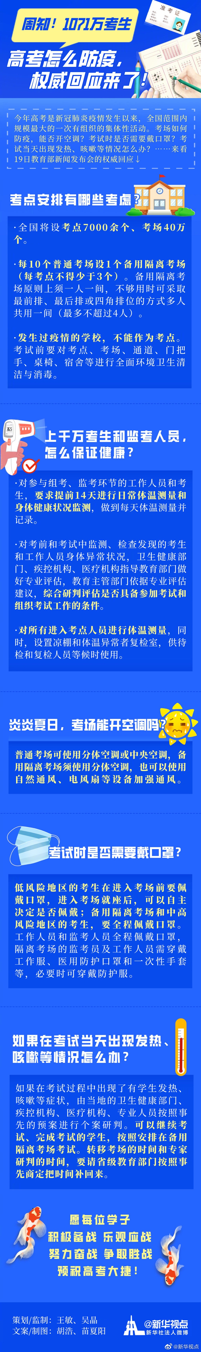 半個多月以后的7月7日和8日,1071萬考生將迎來人生當中的一次大考。今年高考是新冠肺炎疫情發(fā)生以來,全國范圍內(nèi)規(guī)模最大的一次有組織的集體性活動。考場如何防疫,能否開空調(diào)?考試時是否需要戴口罩?考試當天出現(xiàn)發(fā)熱、咳嗽等情況怎么辦?……來看19日教育部新聞發(fā)布會的權威回應↓