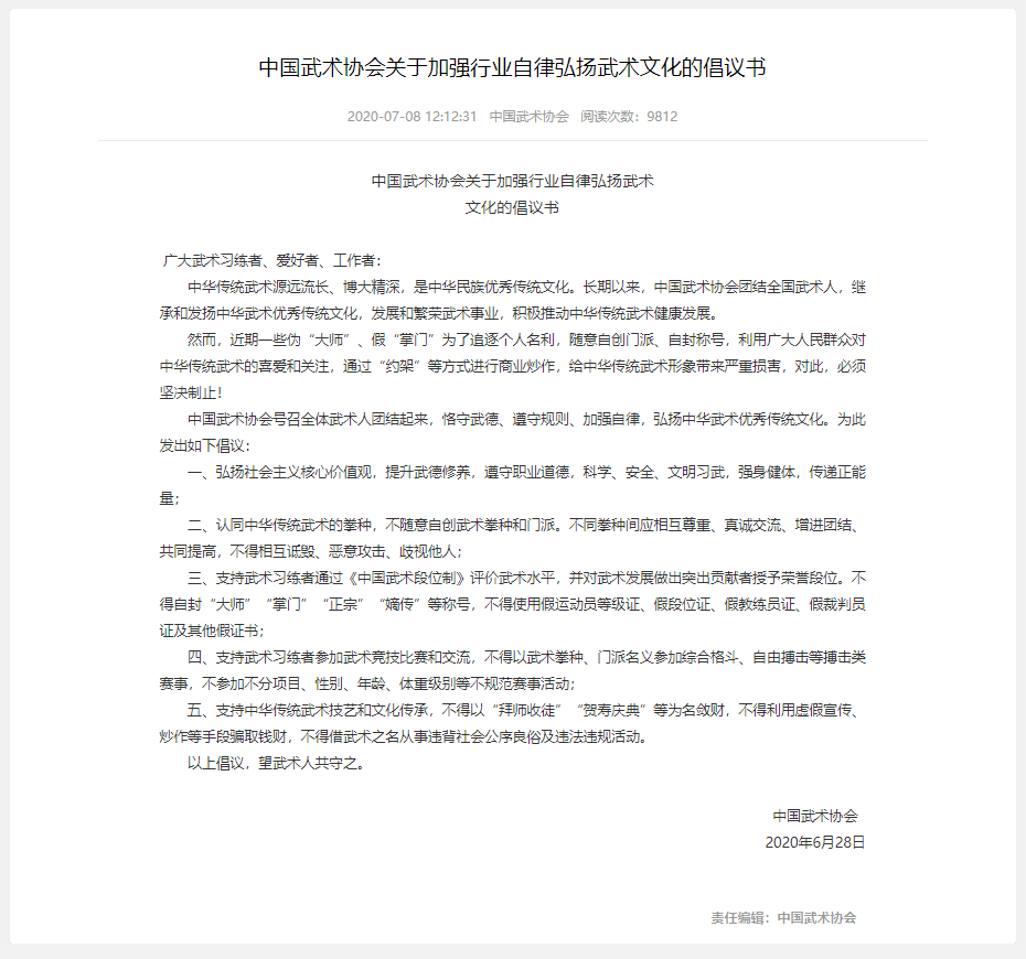 中國武術協會在其網站發布《關于加強行業自律弘揚武術文化的倡議書》,號召全體武術人團結起來,恪守武德、遵守規則、加強自律,弘揚中華武術優秀傳統文化,并倡議武術習練者不得自封“大師”“掌門”“正宗”“嫡傳”等稱號,不得以武術拳種、門派名義參加綜合格斗、自由搏擊等搏擊類賽事,不參加不分項目、性別、年齡、體重級別等不規范賽事活動。