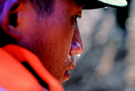 武警江西總隊(duì)上饒支隊(duì)的一名戰(zhàn)士臉上流下的汗水(7月14日攝)。新華社記者萬(wàn)象攝