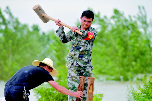 7月12日,江洲鎮(zhèn)柳州村的村支書(shū)洪棉雪(右)和村民一起打樁,加固堤壩。新華社記者彭昭之?dāng)z