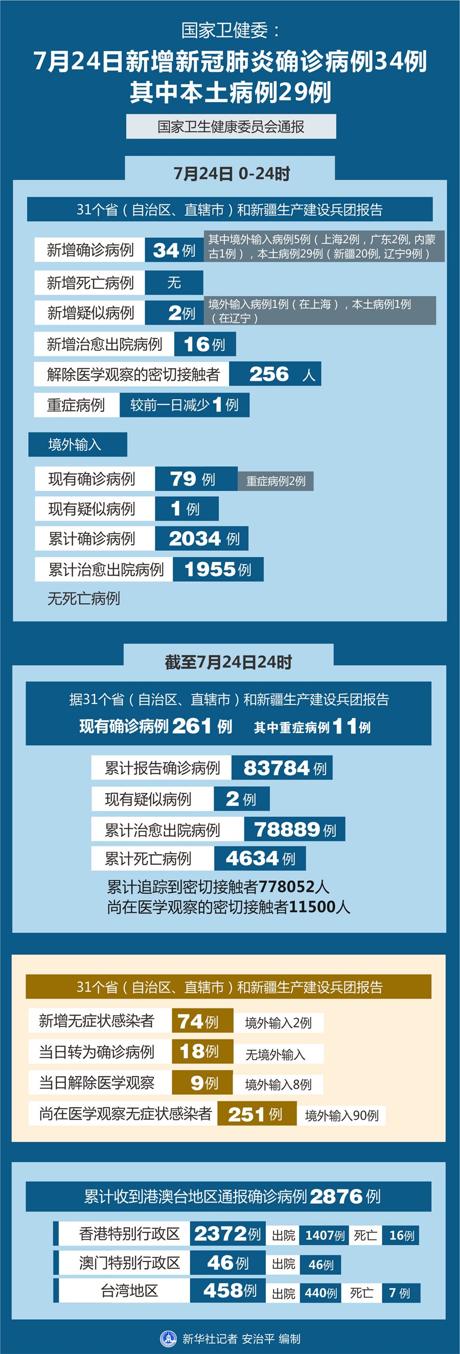 新華社北京7月25日電 國家衛生健康委員會25日通報,7月24日0-24時,31個省(自治區、直轄市)和新疆生產建設兵團報告新增新冠肺炎確診病例34例,其中境外輸入病例5例(上海2例,廣東2例,內蒙古1例),本土病例29例(新疆20例,遼寧9例);無新增死亡病例;新增疑似病例2例,其中境外輸入病例1例(在上海),本土病例1例(在遼寧)。