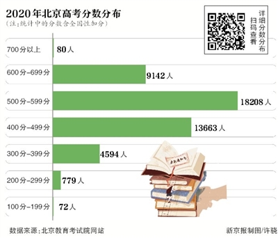 同時,北京教育考試院官網公布了2020年北京市高考考生分數分布。其中,700分以上80人,600分至699分區間共9142人。