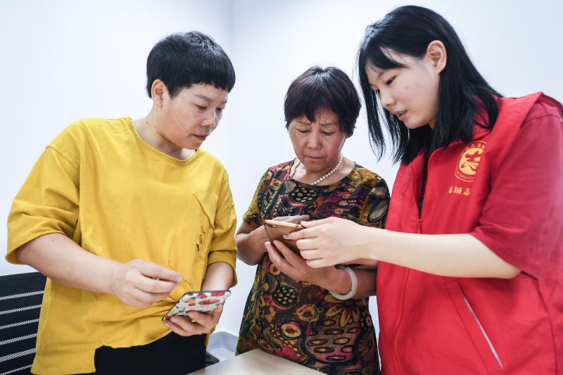 6月4日,在杭州市臨安區錦城街道勝利社區,青年社工指導老人們用手機購物 徐昱/攝
