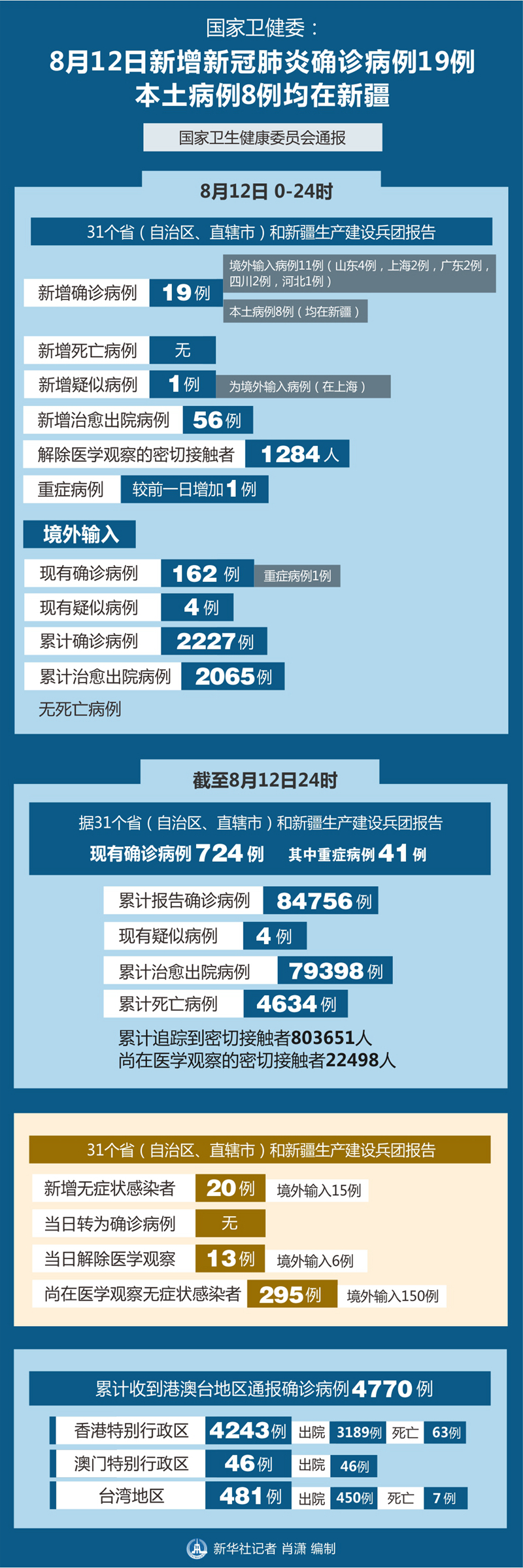 截至8月12日24時(shí),據(jù)31個(gè)省(自治區(qū)、直轄市)和新疆生產(chǎn)建設(shè)兵團(tuán)報(bào)告,現(xiàn)有確診病例724例(其中重癥病例41例),累計(jì)治愈出院病例79398例,累計(jì)死亡病例4634例,累計(jì)報(bào)告確診病例84756例,現(xiàn)有疑似病例4例。累計(jì)追蹤到密切接觸者803651人,尚在醫(yī)學(xué)觀察的密切接觸者22498人。