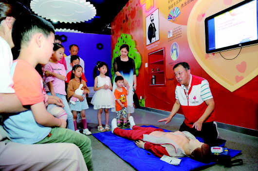 閔華在湖州市科技館為青少年及家屬講解演示心肺復(fù)蘇和AED操作。 受訪者供圖