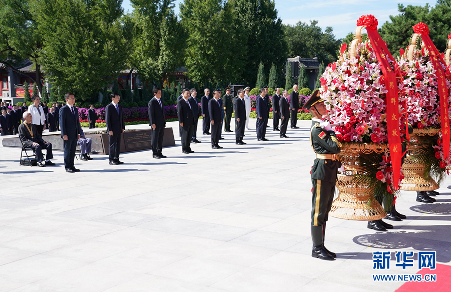 新華社北京9月3日電(記者張曉松、朱基釵)銘記歷史緬懷先烈,珍愛和平開創未來。9月3日上午,紀念中國人民抗日戰爭暨世界反法西斯戰爭勝利75周年向抗戰烈士敬獻花籃儀式在中國人民抗日戰爭紀念館舉行。黨和國家領導人習近平、李克強、栗戰書、汪洋、王滬寧、趙樂際、韓正、王岐山,同各界代表一起出席儀式。