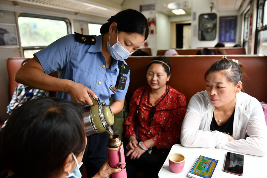 列車上沒有鍋爐間,飲用熱水需要乘務人員從漢中、陽平關車站進行補給。圖為乘務員為旅客添開水。(8月22日攝)
