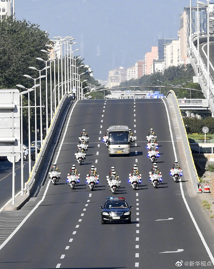 國家勛章和國家榮譽稱號獲得者集體乘坐禮賓車從住地出發,由國賓護衛隊護衛前往人民大會堂。