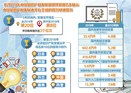 9月14日,中國國家知識產權局知識產權發展研究中心發布的《2019年中國知識產權發展狀況評價報告》顯示,中國知識產權發展水平在全球的排名快速提升,短短5年時間內,排名已從2014年的第20位,快速躍升至2018年的第8位,平均每年提升近3個位次。