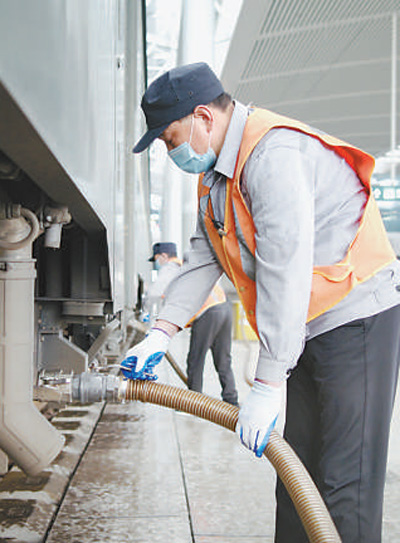 吸污組沿著狹長的車廂線作業,隊員的耳麥里,不時響起離站時間的提醒。以車廂為界,一側是匆忙下車的旅客,一側是緊張作業的小分隊。