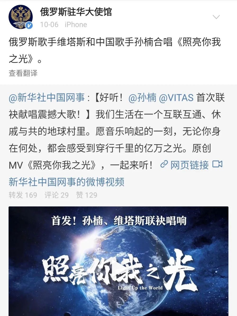 俄羅斯駐華大使館官方微博轉發