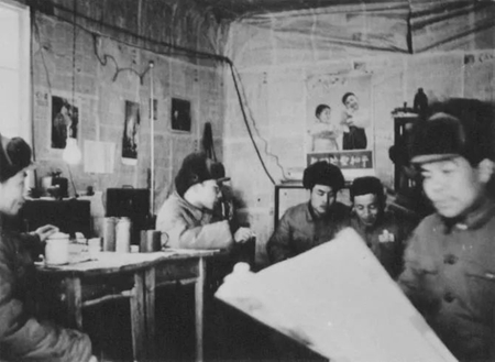 朝鮮戰場的環境十分艱苦,志愿軍總分社的編輯部常年設在陰暗潮濕的山洞里,駐地附近幾次遭到敵機轟炸、掃射。圖為總分社何友、李健華、孫大文等同志在山洞內學習。