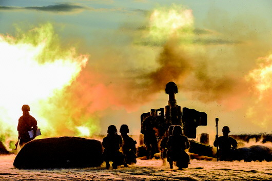 2017年8月25日,第74集團軍某炮兵旅在西北戈壁組織實兵實彈戰術演習,“志愿軍戰歌連”對“敵”實施火力打擊。新華社資料片