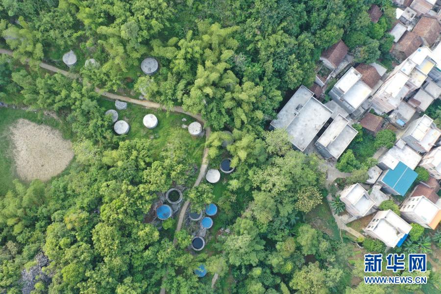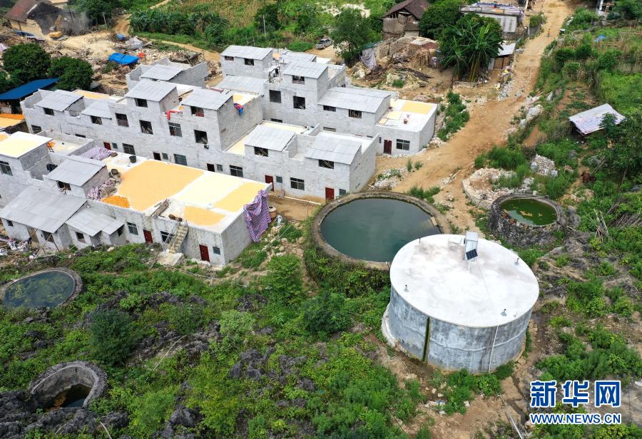 這是7月23日在廣西都安瑤族自治縣三只羊鄉(xiāng)雞峒村拍攝的水柜(無人機照片)。利用山石修建的第1代水柜、用水泥砂石修建的第2水柜以及第3代加蓋并配備抽水設備的水柜,見證了大石山區(qū)村民飲水的變遷。新華社記者 周華 攝
