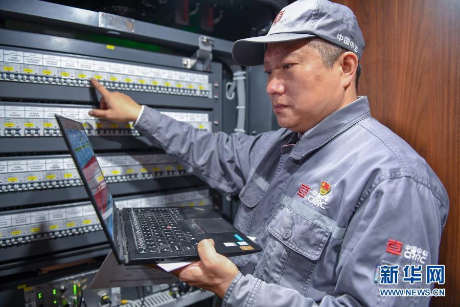 11月25日,在中車長春軌道客車股份有限公司高速動車組制造中心調試車間,羅昭強檢查復興號高鐵列車裝置的工作情況。新華社記者 張楠 攝