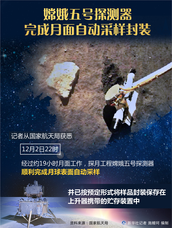 新華社北京12月3日電(記者胡喆)記者3日從國家航天局獲悉,12月2日22時(shí),經(jīng)過約19小時(shí)月面工作,探月工程嫦娥五號探測器順利完成月球表面自動(dòng)采樣,并已按預(yù)定形式將樣品封裝保存在上升器攜帶的貯存裝置中。