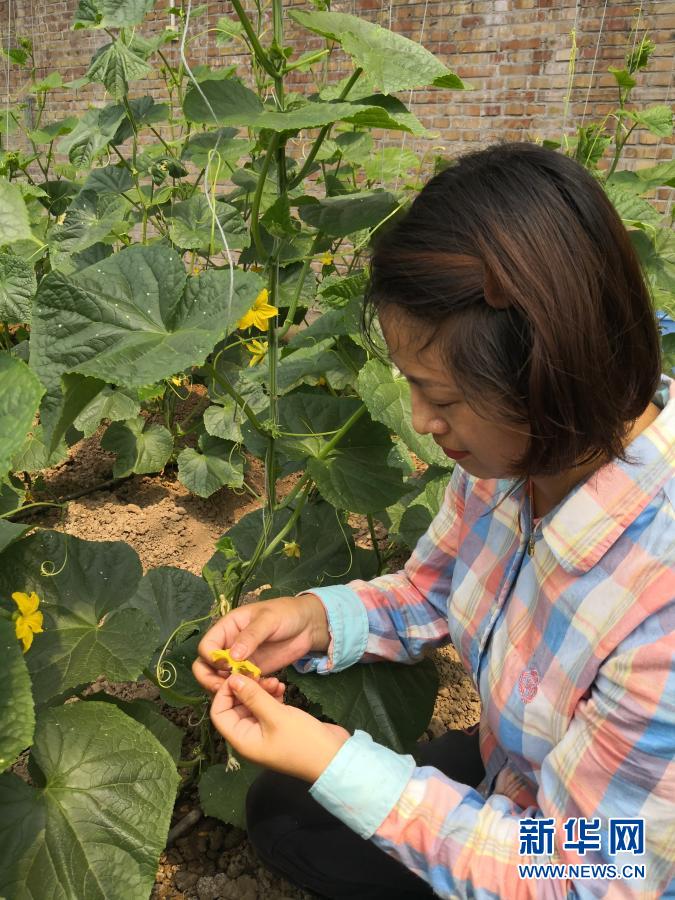 李愚鶴在田間進(jìn)行人工授粉(2019年6月27日攝)。新華社發(fā)(天津科潤黃瓜研究所供圖)