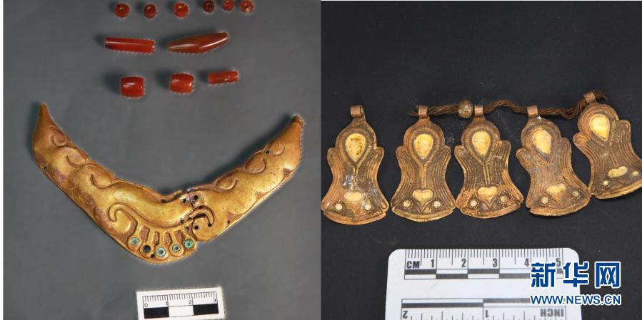 桑達隆果墓地出土的金項飾、瑪瑙等(資料照片)。新華社發