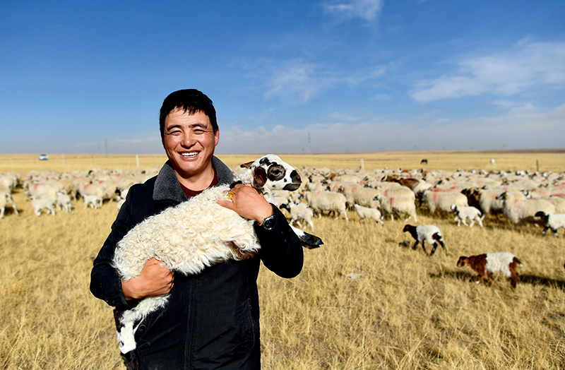 青海省剛察縣泉吉鄉寧夏村牧民達日杰懷抱一只小羊羔(11月12日攝) 張宏祥攝/本刊